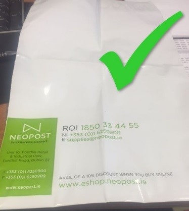 Ink cartridges bought from third party companies tend to be old Quadient or Neopost ink cartridges, that have been refilled with inferior ink, by way of a hole being drilled in to the cartridge and re-sealed – which are also prone to leaking. This is why you should only buy official Quadient ink directly from us on the Quadient eShop, or by contacting the office on 1850 33 44 55 or supplies.ie@quadient.com, thus ensuring you better quality and machine safety.