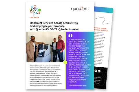 “As a progressive and adapted company, we are committed to finding the best tools that empower our employees to perform their best. We are pleased to have found a superior machine in Quadient folder inserters and to have maintained a strong relationship with the company through all this time. Handirect has been able to not only improve employee proficiency, but also productivity and efficiency in serving customers thanks to Quadient’s folder inserters.”