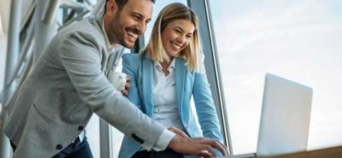 2 coworkers smiling looking at a computer